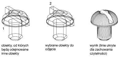 Za pomocą polecenia RÓŻNICA można usunąć wspólną objętość lub powierzchnię jednego zestawu obiektów z innego. Przykładowo polecenie RÓŻNICA umożliwia utworzenie otworów w części mechanicznej przez odjęcie walców od obiektu.