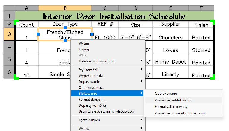 Domyślnie wszystkie komórki w tabeli wyodrębniania danych są zablokowane do edycji i odblokowane do zmian formatowania. Można odblokowywać i blokować komórki do formatowania i edytowania za pośrednictwem menu skrótów tabeli.