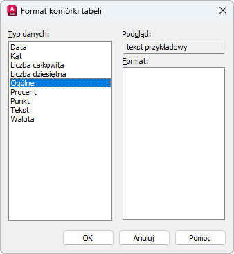 W zależności od wybranego typu danych wyświetla listę stosownych typów formatu. Na przykład, jeśli zostanie wybrany typ danych Kąt, wówczas zostaną wyświetlone opcje takie jak Stopnie dziesiętne, Grady, Radiany itp.