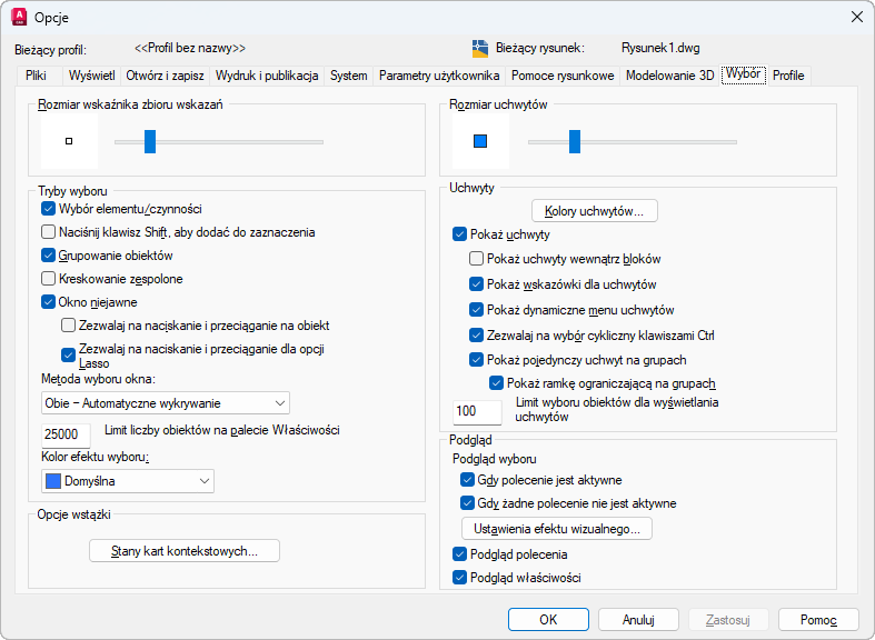 Wyświetla podgląd wyboru, gdy żadne polecenie nie jest aktywne. (SELECTIONPREVIEW — zmienna systemowa)