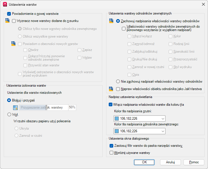Kontroluje kiedy wyświetlane są powiadomienia o nowych warstwach, zachowanie, gdy niektóre warstwy są izolowane, czy filtry warstw są stosowane do paska narzędzi Warstwy, a także kolor tła nadpisań rzutni w Menedżerze właściwości warstw.
