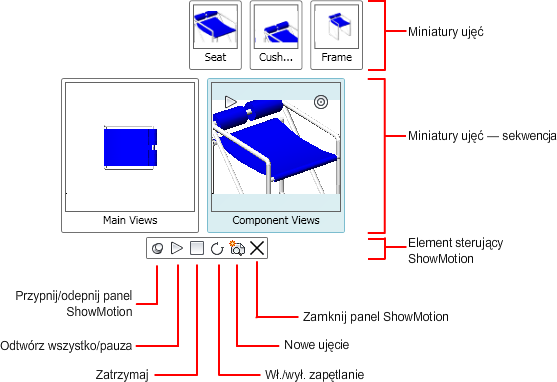 Narzędzie ShowMotion składa się z trzech głównych części: miniatur ujęć, miniatur sekwencji ujęć i sterowania ShowMotion. W dolnej części elementu sterującego ShowMotion można odtwarzać animacje przypisane do ujęcia, unieruchamiać i usuwać unieruchomienia narzędzia ShowMotion oraz zamykać narzędzie ShowMotion. Miniatury ujęć i sekwencji ujęć umożliwiają nawigowanie po ujęciach dostępnych w bieżącym modelu.