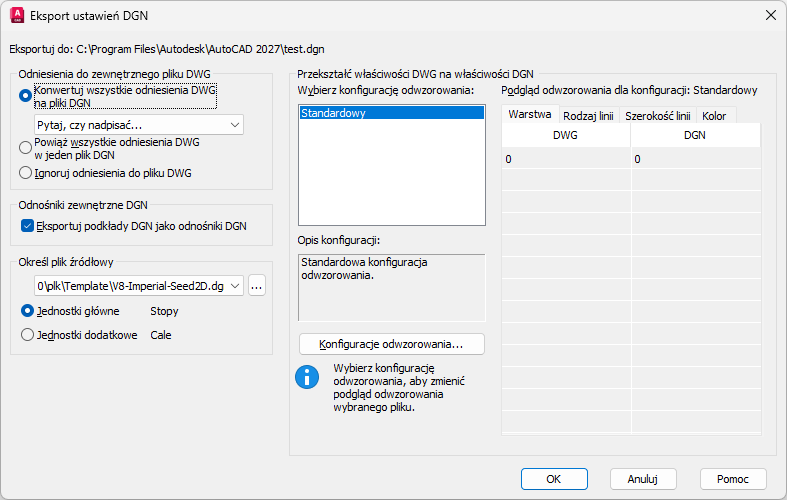 Wyświetla listę wszystkich właściwości eksportowanego pliku DWG (w kolumnie DWG) i wybranej konfiguracji odwzorowania (w kolumnie DGN).