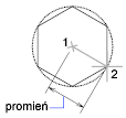 Określając promień urządzeniem wskazującym, wyznacza się kąt obrotu i rozmiar wieloboku. Podanie promienia z klawiatury rysuje dolny bok wieloboku zgodnie z bieżącym kątem obrotu siatki lokalizacyjnej.
