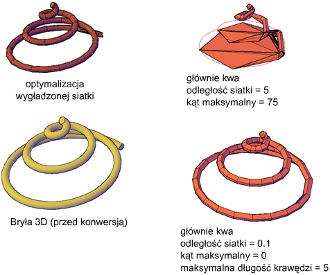 Można również sterować przyleganiem do oryginalnego kształtu, ustawiając maksymalną odległość odsunięcia, kąty, współczynniki kształtu i długości krawędzi dla nowych ścian. Na następującym przykładzie pokazano helisę bryłową 3D, która została przekształcona w siatkę przy użyciu różnych ustawień reprezentacji. Zoptymalizowana wersja siatki została wygładzona, ale pozostałe dwie konwersje nie zawierają gładkości. Należy jednak zauważyć, że konwersja Głównie kwa o mniejszych wartościach reprezentacji tworzy obiekt siatki przylegający najbardziej do oryginalnej wersji. Wygładzenie tego obiektu poprawi jego wygląd nawet bardziej.