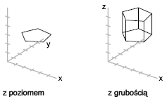 Grubość ustala odległość, do której wyciągane są obiekty 2D pod lub nad dany poziom. Wartość dodatnia zostanie wyciągnięta wzdłuż dodatniej osi Z; wartość ujemna zostanie wyciągnięta wzdłuż ujemnej osi Z.
