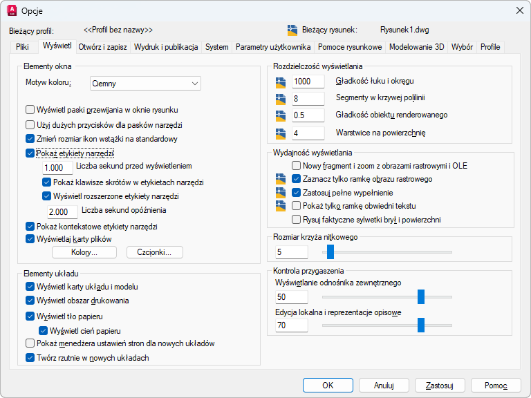 Wyświetla karty Układ i Model na dole obszaru rysunku. Wyczyszczenie tej opcji powoduje, że zamiast kart są wyświetlane przyciski na pasku stanu.