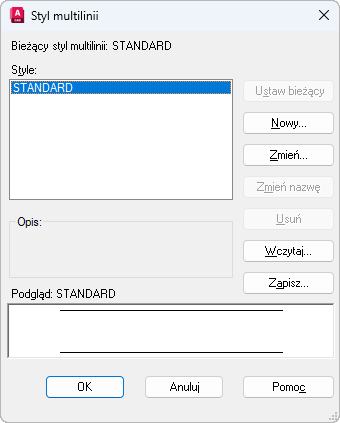 Zmienia nazwę aktualnie wybranego stylu multilinii. Nie można zmienić nazwy stylu multilinii STANDARD.