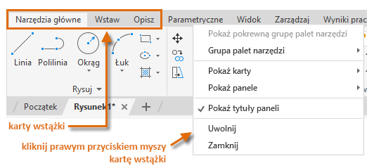 - Kliknij pasek tytułu i przeciągnij uwolnioną wstążkę do lewej, prawej lub górnej krawędzi obszaru rysunku