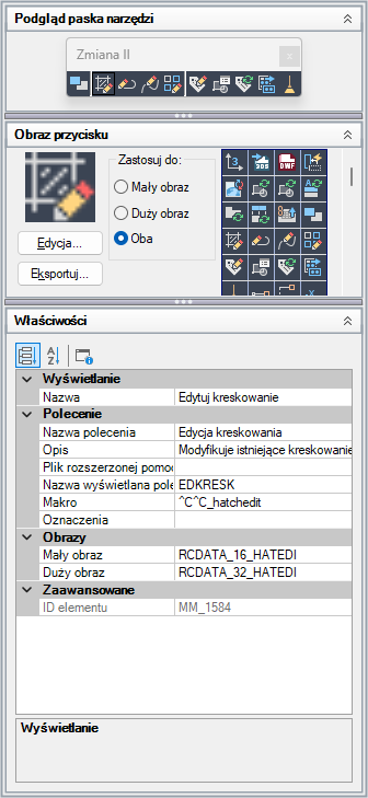 Panel Wyświetlanie dynamiczne zawiera podgląd elementu interfejsu użytkownika na panelu Dostosowywane pliki. Umożliwia edycję obrazu polecenia wybranego na panelu Lista poleceń oraz właściwości charakterystycznych dla elementu wybranego na panelu Dostosowywane pliki lub na panelu Lista poleceń.