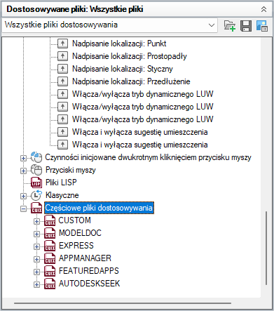 W tym panelu można tworzyć i modyfikować elementy interfejsu użytkownika, takie jak karty i panele wstążki oraz pasek narzędzi szybkiego dostępu. Wzdłuż górnej krawędzi panelu znajdują się narzędzia, które mogą być używane do wczytywania częściowych plików adaptacji do głównego pliku adaptacji, zapisywania zmian we wczytanych plikach adaptacji oraz sterowania sposobem wyświetlania wczytanych plików adaptacji.
