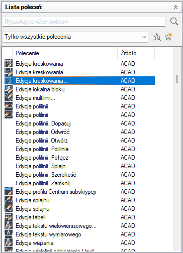 U góry panelu Lista poleceń znajduje się pole Wyszukaj na liście poleceń umożliwiające przefiltrowanie listy poleceń na podstawie wprowadzonego ciągu tekstowego. Ciąg tekstowy jest dopasowywany do dowolnej części nazwy polecenia, a wyniki są wyświetlane w polu Lista poleceń.
