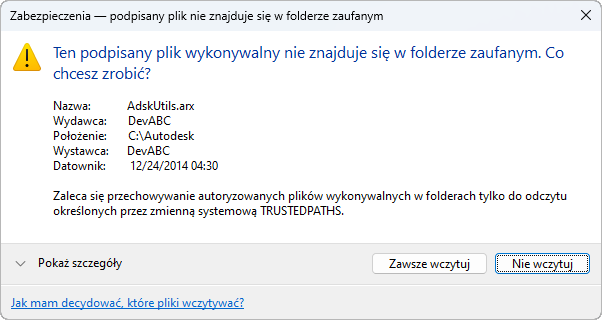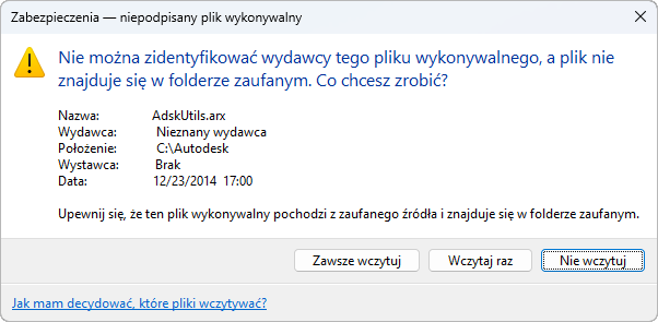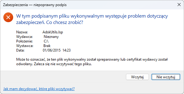 Podczas wczytywania niestandardowego pliku programu, który został podpisany cyfrowo, programy AutoCAD lub AutoCAD LT sprawdzają podpis cyfrowy dołączony do pliku. Wyświetlane jest okno komunikatu z informacją, czy można zweryfikować podpis cyfrowy, co pozwala użytkownikowi wczytać plik do środowiska rysunku albo anulować wczytywanie.