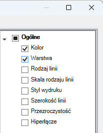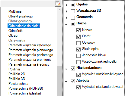 Jeśli typ obiektu jest zaznaczony, właściwości tego typu obiektu są wyświetlane na palecie Szybkie właściwości, gdy: wybrany jest obiekt tego samego typu, w zmiennej systemowej QPMODE ustawiona jest wartość 2 i włączona jest zmienna systemowa PICKFIRST. Usuń znacznik znajdujący się obok typu obiektu, aby usunąć wybrany typ obiektu z palety Szybkie właściwości.