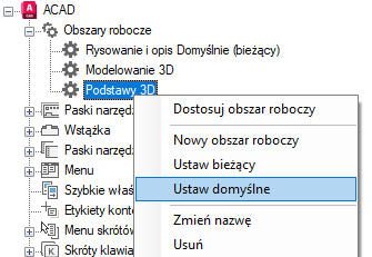 Obszary robocze w pliku CUIx mogą być oznaczane jako domyślne. Ustawienie obszaru roboczego jako domyślnego określa, że ma on zostać przywrócony podczas wczytywania pliku CUIx do programu po raz pierwszy lub po wczytaniu pliku CUIx za pomocą polecenia WCZYTAJCUI.