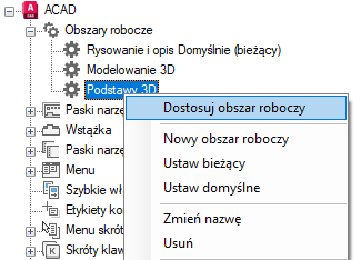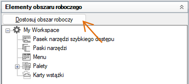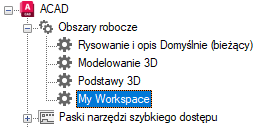 Na karcie Dostosuj, na panelu Dostosowywane pliki: <nazwa pliku> kliknij znak plusa (+) obok węzła Obszary robocze, aby go rozwinąć.