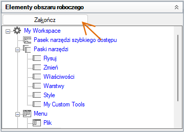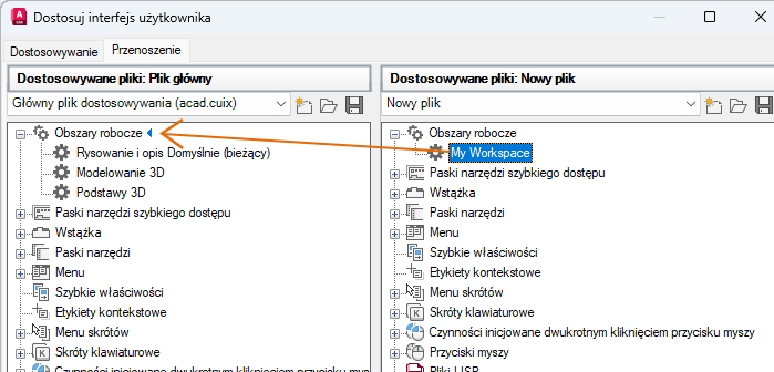 W panelu Dostosowywania w <nazwa pliku> (po prawej stronie) przeciągnij obszar roboczy z pliku CUIx do węzła Obszary robocze w głównym pliku CUIx w panelu Dostosowywania w <nazwa pliku> (po lewej stronie).