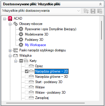 Uwaga: Obok węzłów paska narzędzi szybkiego dostępu, kart wstążki, pasków narzędzi, menu rozwijanych i częściowego pliku CUIx są teraz wyświetlane pola wyboru, więc można dodać elementy do obszaru roboczego.