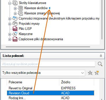 - Aby utworzyć klawisz skrótu, przeciągnij polecenie z panelu Lista poleceń do węzła Klawisze skrótów znajdującego się w panelu Dostosowywane pliki: <nazwa pliku>.