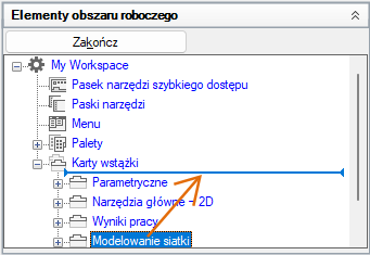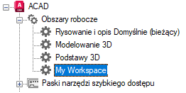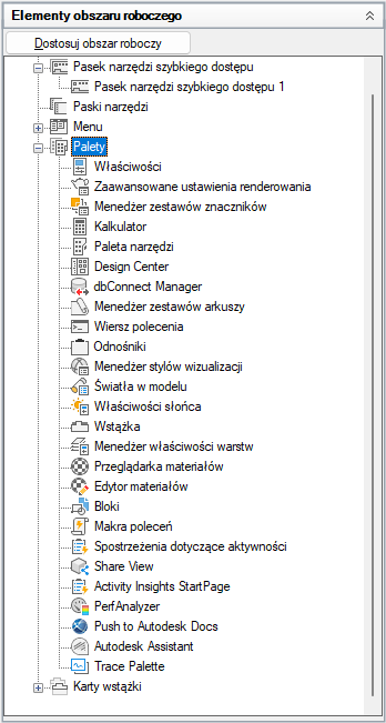 - Na karcie Dostosuj, na panelu Dostosowywane pliki: <nazwa pliku> kliknij znak plusa (+) obok węzła Obszary robocze, aby go rozwinąć.