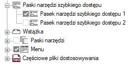 - Na panelu Dostosowywane pliki: <nazwa pliku> kliknij znak plusa (+) obok węzła Paski narzędzi szybkiego dostępu, aby go rozwinąć.