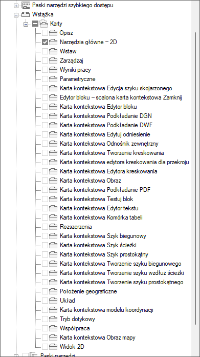 Za pomocą edytora CUI można sterować wyświetlaniem paska narzędzi szybkiego dostępu, kart i paneli wstążki, palet narzędzi, pasków narzędzi i menu rozwijanych.