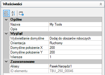 Uwaga: Zmiany wprowadzone tutaj we właściwościach paska narzędzi mają wpływ tylko na początkowy wygląd paska narzędzi po wczytaniu pliku adaptacji (CUIx). Zaleca się kontrolowanie wyglądu paska narzędzi za pomocą obszaru roboczego.
