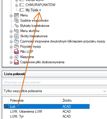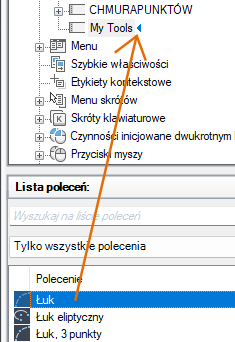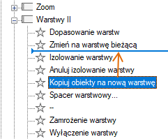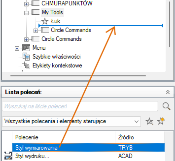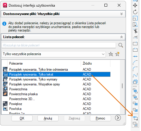- Na panelu Lista poleceń przeciągnij polecenie, które chcesz dodać, do paska narzędzi na panelu Dostosowywane pliki: <nazwa pliku>.