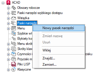 - Na karcie Dostosuj w panelu Dostosowywane pliki: <nazwa pliku> kliknij znak plusa (+) obok węzła Paski narzędzi, aby go rozwinąć.