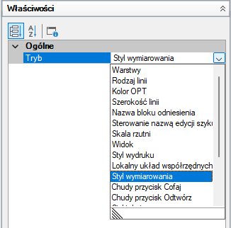 - Na panelu Właściwości, w polu Tryb kliknij strzałkę w dół, aby wyświetlić listę wszystkich dostępnych elementów sterujących paska narzędzi.