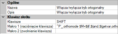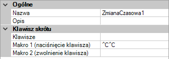 - W polu Makro 2 (zwolnienie klawisza) wprowadź makro, które zostanie wykonane po zwolnieniu klawisza zmiany czasowej. Jeżeli nie zostanie zdefiniowana żadna wartość, wówczas zwolnienie klawisza będzie przywracać poprzedni stan aplikacji i ustawień rysunku (istniejący przed wykonaniem zmiany czasowej).