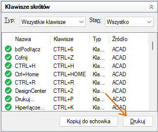 - W panelu Skróty wybierz typ i stan skrótów klawiaturowych, które mają zostać wydrukowane.