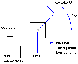 Kierunek X jest wyznaczany przez obiekt, przy którym zakotwiczony jest komponent blokowy. Jeśli komponent blokowy jest zakotwiczony przy punkcie wstawiania etykiety, kierunek X jest ustalany względem następujących ustawień z grupy Odnośnik orientacji zlokalizowanej na karcie Ogólne: