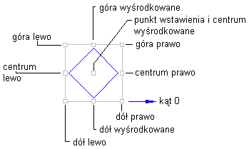 Określa położenie komponentu blokowego zaczepionego w punkcie zakotwiczenia. Lokalizacja punktów dołączenia jest wyznaczana na podstawie położenia prostokąta zawierającego cały blok. Rozmiar prostokąta uwzględnia wartość odstępu ustawianą w kategorii Ramka. Przykładowe rozmieszczenie punktów dołączenia pokazano na ilustracji poniżej: