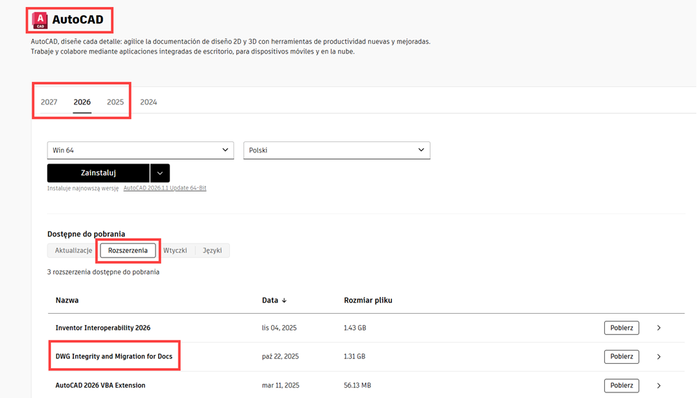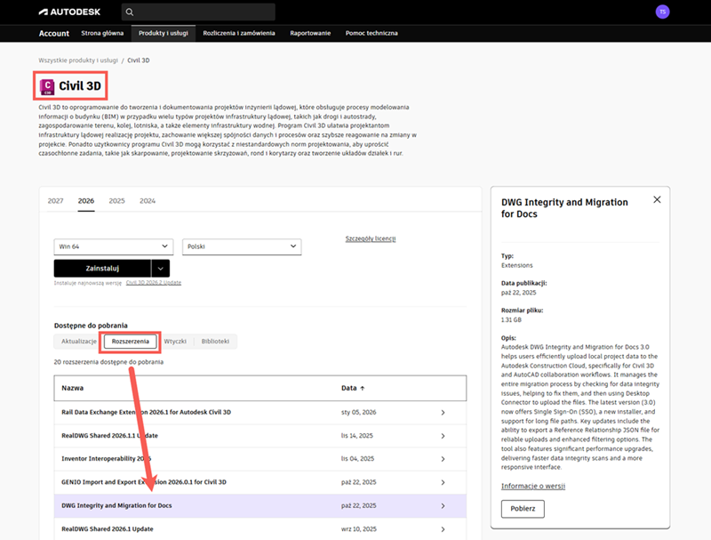 Instalator narzędzia DWG Integrity and Migration for Docs jest dostępny w systemie manage.autodesk.com, tylko dla klientów z ważną licencją AutoCAD lub Civil 3D 2024–2026.