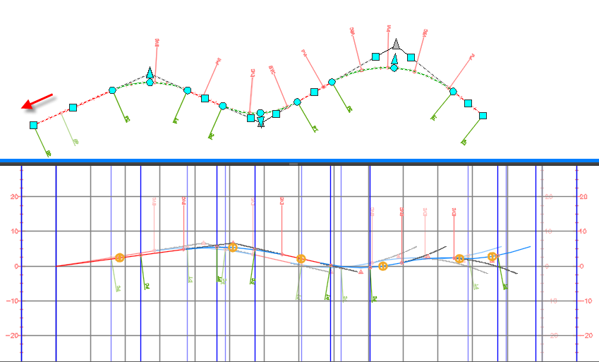 Na poniższej ilustracji przedstawiono linię trasowania (górna rzutnia) i skojarzony z nią profil (dolna rzutnia).