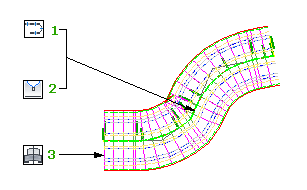 Polecenie Utwórz prosty korytarz jest idealne do tworzenia prostych korytarzy na podstawie pojedynczej linii trasowania (1), profilu (2) wzdłuż linii trasowania, a także na podstawie zespołu (3) w poprzek. Przez edycję korytarza można go później uczynić bardziej złożonym.