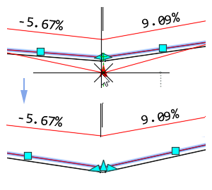 Te uchwyty umożliwiają zmianę kąta w punkcie przecięcia w rurociągu. Kąt jest mierzony od osi segmentu rurociągu. Po wybraniu uchwytu można przenieść rurociąg lub wprowadzić kąt odchylenia do zastosowania. Podczas przesuwania w kierunku rurociągu zostanie on wydłużony tak, jak w przypadku uchwytów Przedłuż.