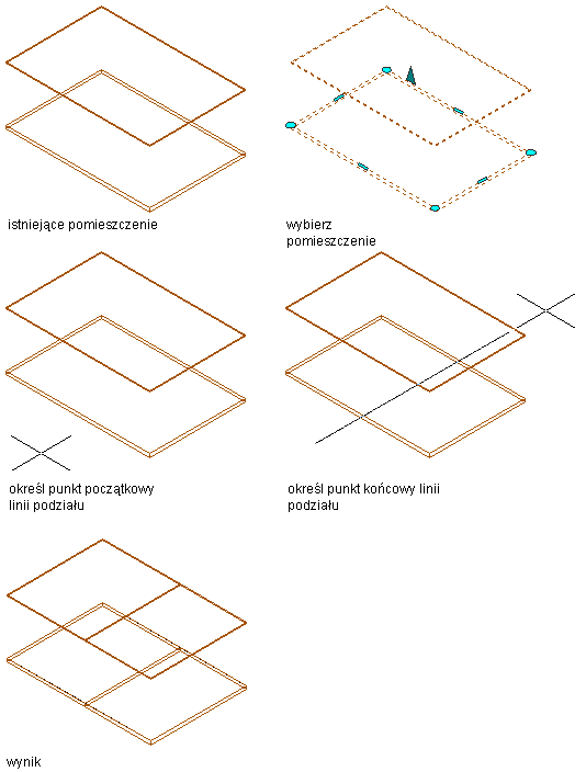 Szkic lub blok zawierający szkic można podzielić na dwie (lub więcej) części definiowane przez rysowaną linię podziału. Następnie można wybrać części po prawej lub lewej stronie linii. Jeśli po zastosowaniu tej opcji dzielony jest obiekt o zamkniętej obwiedni, obie części są ponownie tworzone jako zamknięte. Jeśli dzielona jest wzdłuż długości polilinia w formie zygzaka, tworzonych jest wiele wybieralnych segmentów.