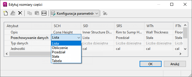 - Aby dodać listę dostępnych rozmiarów części, zmień jej parametr typu przechowywania danych na Lista.