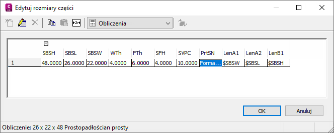 Uwaga: W oknie dialogowym Edytuj rozmiary części nie można edytować obliczonych wartości zdefiniowanych w modelu. Aby zmienić te wartości, należy dokonać edycji modelu.