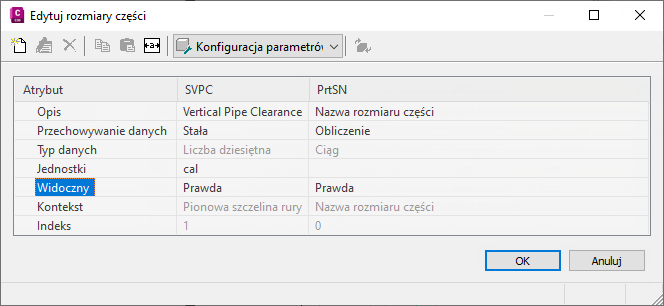 Zostanie wyświetlone okno dialogowe Edytuj rozmiary części zawierające wszystkie dostępne obecnie parametry rozmiaru wybranej części. Dla przykładowej prostej struktury walcowej domyślnymi parametrami rozmiaru są między innymi Nazwa rozmiaru części (PrtSN) i Pionowa szczelina rury struktury (SVPC).