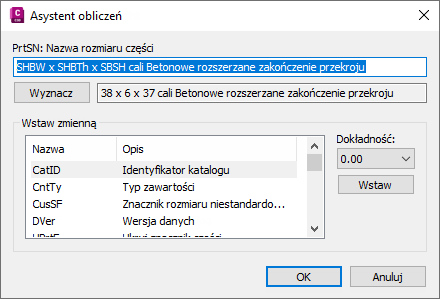 Ważne: Nazwa rozmiaru części generowana jest przy użyciu funkcji FormatNumber języka VB (Visual Basic) Script i prostych podstawień ciągów. Kluczowe znaczenie ma stosowanie poprawnej składni. Należy skorzystać z Kalkulatora, aby potwierdzić poprawność ciągu.