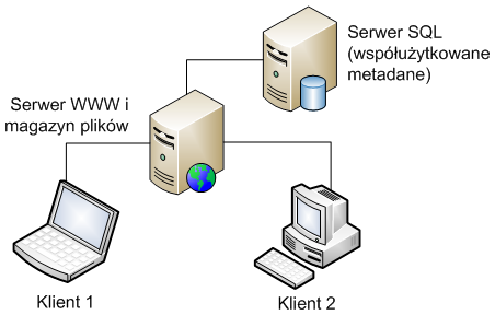 Dla większości zespołów zaleca się konfigurację w jednej lokalizacji. Serwer Vault jest instalowany w jednym systemie, a składniki klienckie są instalowane na każdym komputerze, który wymaga komunikacji z tym serwerem. Na serwerze są przechowywane wszystkie główne kopie plików danych, a klienci mogą mieć dostęp do plików przechowywanych na serwerze. Jeśli system ma pracować z największą wydajnością, zaleca się korzystanie z dedykowanego serwera zarówno dla składnicy plików, jak i dla współużytkowanych metadanych.