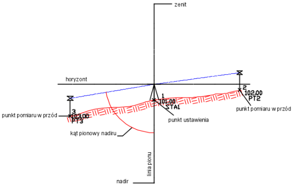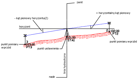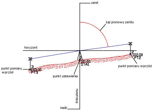 Kąt powyżej lub poniżej płaszczyzny poziomej. Kąt wyrażony jest jako DDMMSS od tego horyzontu. Kąty pionowe odzwierciedlające nachylenie w dół od pikiety instrumentu mają wartości ujemne. Kąty zenitu są podobne do kątów pionowych, z tym że mają przypisaną pionową płaszczyznę odniesienia.