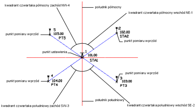 Kąt mierzony od północy lub południa, w zależności od tego, która strona jest bliżej, określony dodatkowo oznaczeniem: wschód lub zachód. Kąt ten ma zawsze wartość mniejszą niż 90 stopni (PI/2 radianów lub 100 gradów) i istnieją do niego odnośniki numeru kwadrantu.