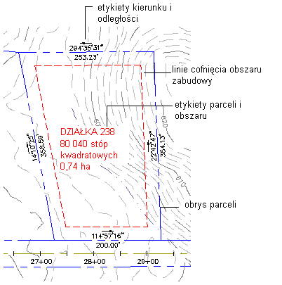 Każda działka ma przypisaną etykietę obszaru, który odnosi się do działki jako całości. Kliknięcie etykiety obszaru powoduje zaznaczenie działki. Działka może również zawierać zdefiniowane etykiety segmentów wraz z towarzyszącymi tabelami, w których są wyświetlane informacje o działce. Etykiety mogą zawierać pola właściwości zdefiniowanych przez użytkownika.