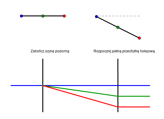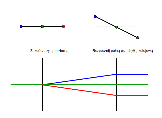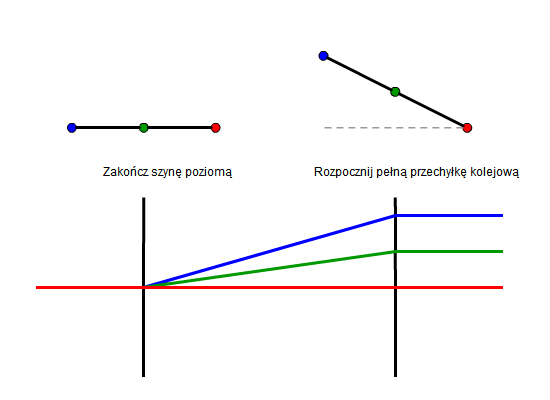 Każdy temat zawiera ilustrację pokazującą przekroje poprzeczne, które przedstawiają dwie szyny i oś w pikietach krytycznych: Zakończ szynę poziomą i Rozpocznij pełną przechyłkę kolejową. Pod przekrojami poprzecznymi, profil przedstawia przejście dwóch szyn i osi od szyny poziomej do pełnej przechyłki kolejowej: