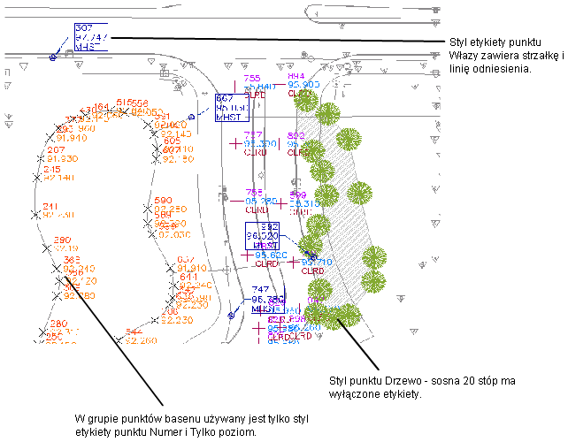 Punkty są oznaczane niepowtarzalnymi nazwami i numerami. Każdy punkt ma właściwości, które mogą obejmować takie informacje, jak współrzędna północna i wschodnia, rzędna i opis. Punkt wyświetlany na rysunku może mieć dodatkowe właściwości, które sterują jego wyświetlaniem, takie jak styl punktu, styl etykiety punktu i warstwa.