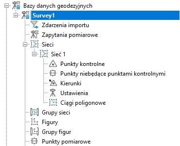 Na tej karcie są wyświetlane dane z projektów podzielone między bazy danych projektów, sprzętu i prefiksów figur. Bazy projektów zawierają dane punktów pomiarowych, sieci i figur. Bazy sprzętu zawierają informacje o standardowych odchyleniach i innych parametrach roboczych poszczególnych urządzeń pomiarowych. W bazie prefiksów figur są zapisywane procedury konwersji stosowane podczas generowania figur działek, budynków i innych obiektów na podstawie punktów pomiarowych.